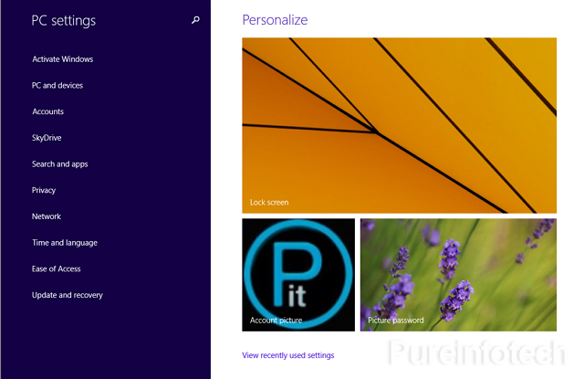 Finally, another small changes can be found the PC settings: Microsoft now by default shows the Personalized settings including access to the Lock screen, Account picture, and Password picture, or from the same page you can click “View recently used settings” to show a list of recently change settings.